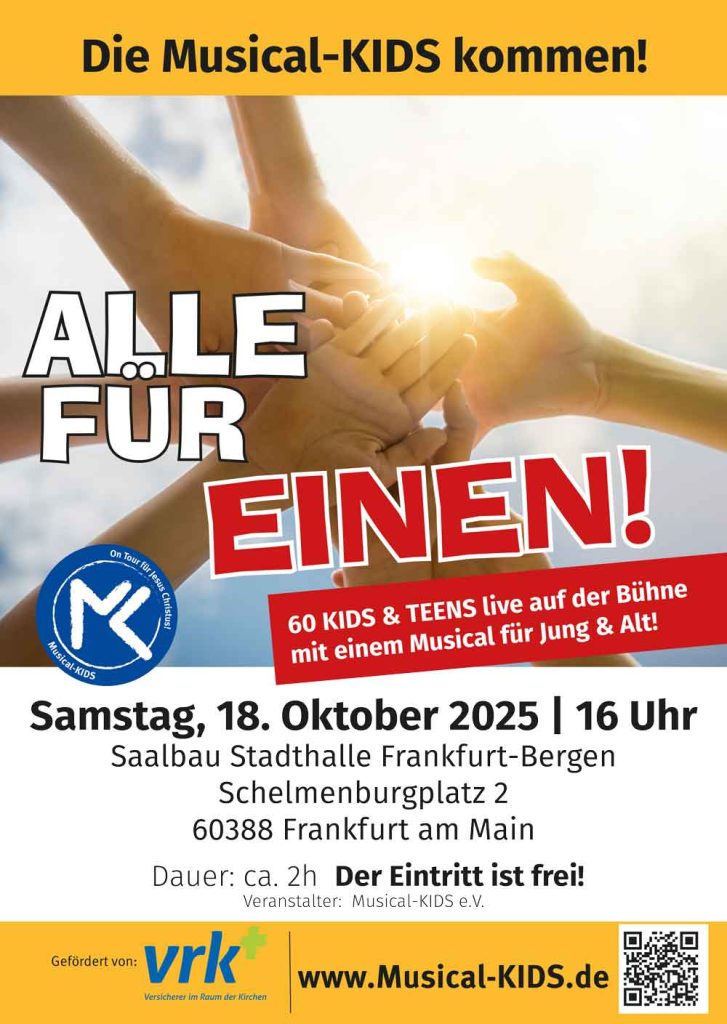 Alle für EinenMehr InfosDie Musical-KIDS Tour 2025BEWEGENDWeitere InfosSpannend und bewegend! Der Verräter!Weitere INFOSKIDS-TOUR 2025LACHEN-SPEYERDORF